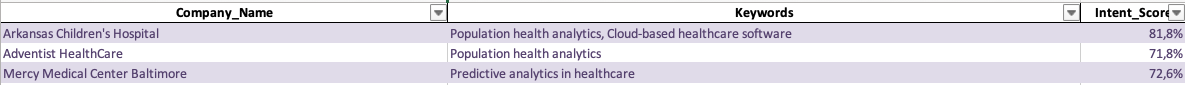 A numerical score (ranging from 0 to 100%) indicating the level of interest a company has shown in the specified keywords. Higher scores reflect stronger intent, such as active searches, content engagement, or discussions related to the topics.